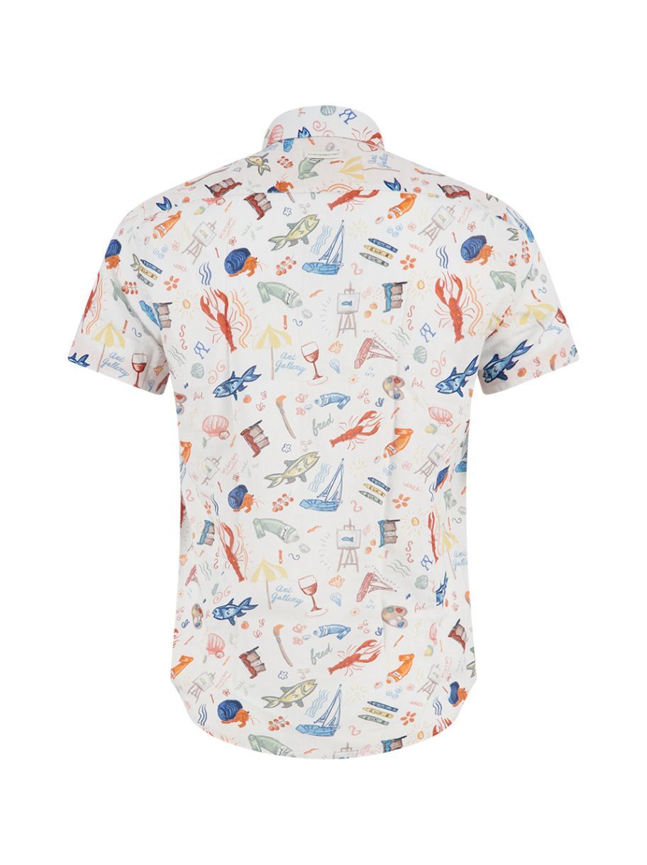 Chemise à manches courtes au style ludique et estival, ornée d’un imprimé coloré inspiré de l’univers balnéaire. Son tissu léger et sa coupe classique offrent un confort optimal, tandis que les illustrations — poissons, bateaux, accessoires de plage et éléments gourmands — apportent une touche artistique et décontractée. Une pièce parfaite pour un look vacances affirmé et original. Caractéristiques : • Coupe classique confortable • Manches courtes • Col boutonné • Imprimé multicolore à thème bord de mer • Tissu léger et agréable à porter • Coloris clair idéal pour l’été