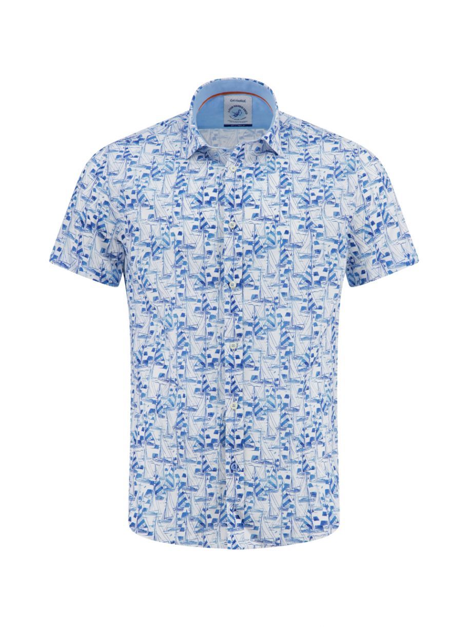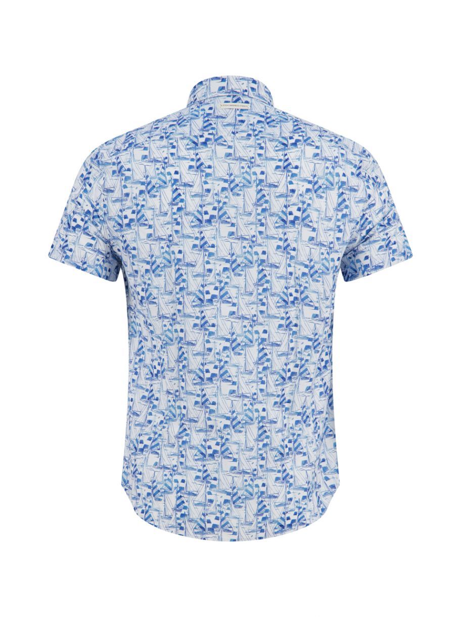 Chemise à manches courtes au style nautique et estival, animée par un imprimé de voiliers dans différentes nuances de bleu. Son tissu léger et sa coupe classique offrent un confort optimal, tandis que le motif dynamique apporte une touche fraîche et décontractée, parfaite pour les journées ensoleillées ou les sorties en bord de mer.