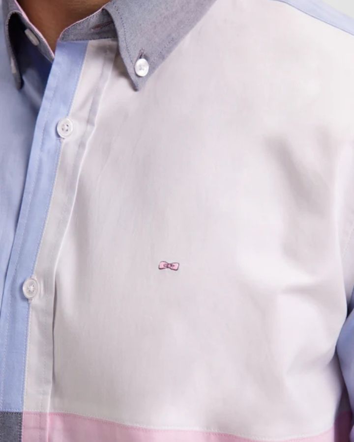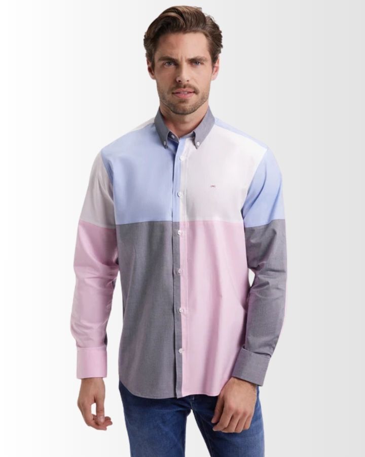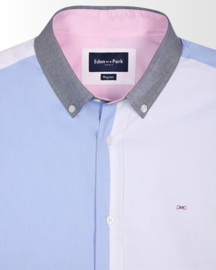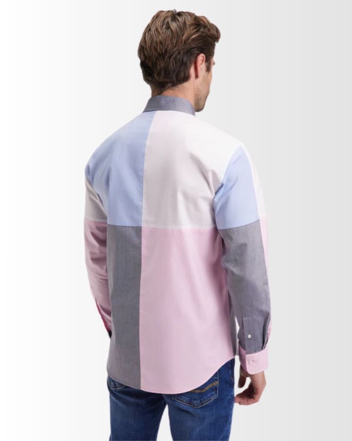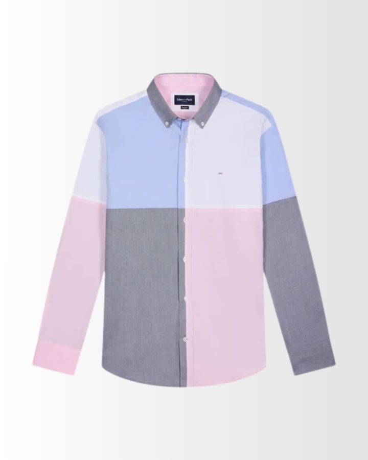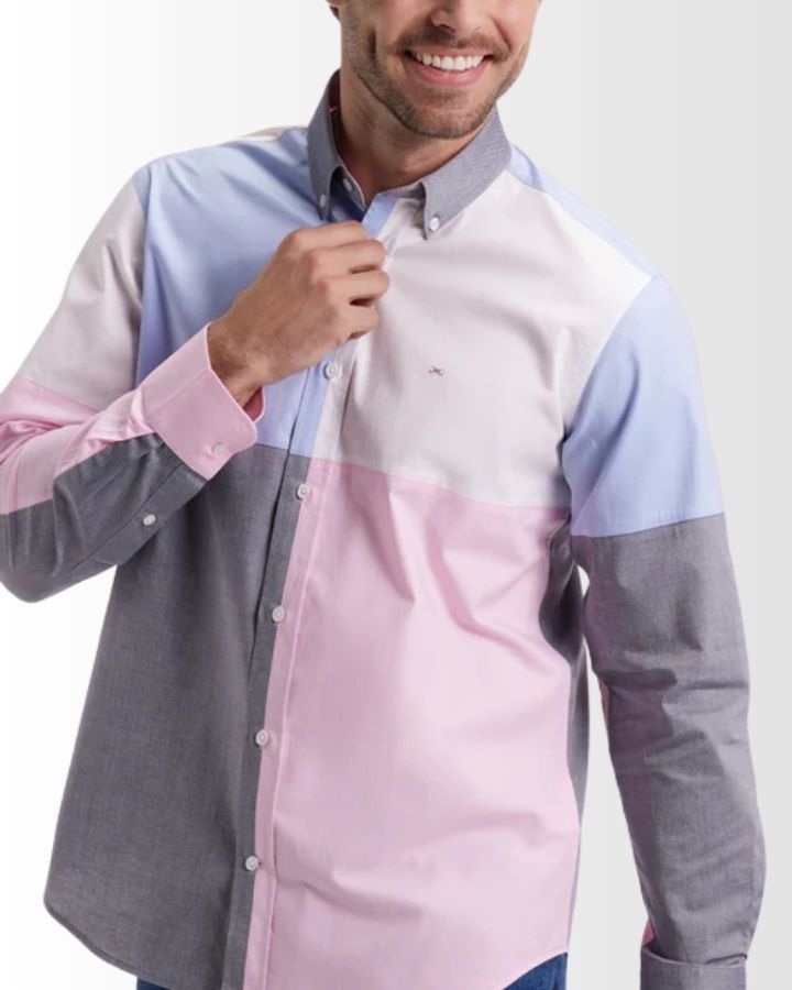 Apportez une touche d’originalité à votre dressing avec cette chemise color block au design audacieux. Elle combine des teintes pastel et neutres : bleu ciel, blanc, rose pâle et gris anthracite, pour un look à la fois moderne et raffiné. Son col boutonné et ses finitions soignées en font une pièce idéale pour un style casual chic. Confectionnée dans une matière légère et agréable, elle assure confort et élégance au quotidien. À porter avec un jean ou un pantalon chino pour un effet garanti. Un choix parfait pour ceux qui aiment se démarquer avec subtilité.