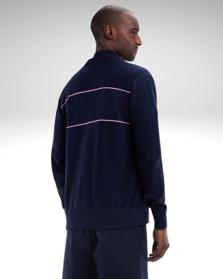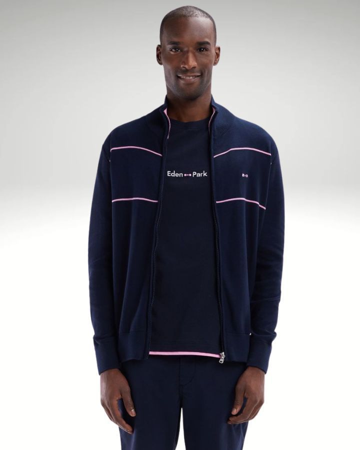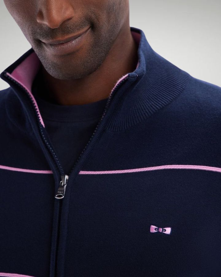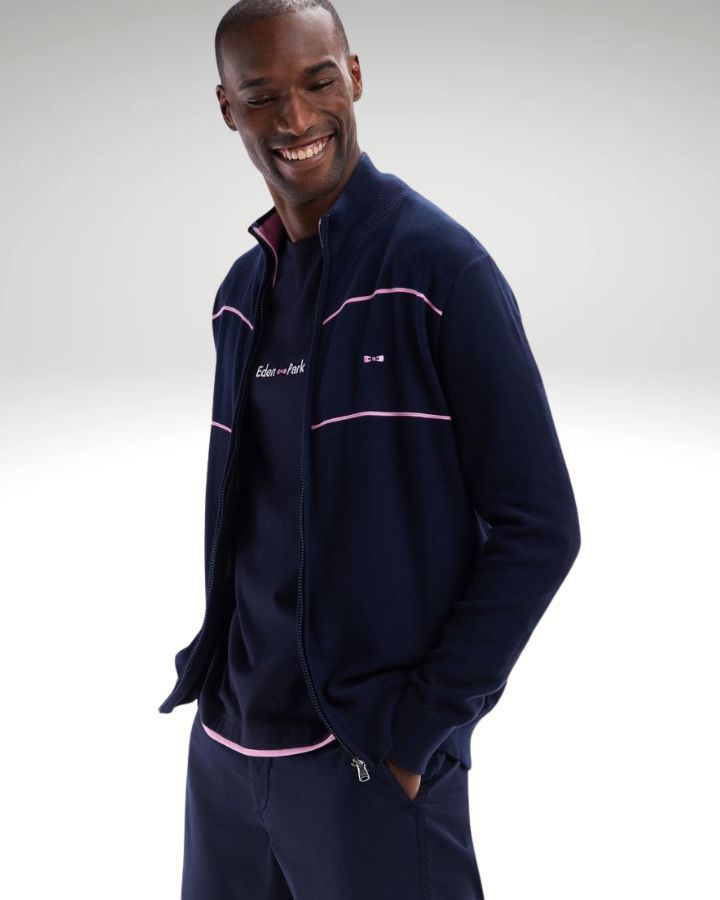 Ce cardigan zippé incarne l’élégance sportive propre à Eden Park. Confectionné dans une maille douce et confortable, il se distingue par ses lignes contrastantes roses qui soulignent la carrure avec subtilité. Son col montant, ses finitions en bord-côte et sa coupe moderne en font une pièce facile à superposer. Le logo nœud papillon brodé sur la poitrine apporte la touche finale, fidèle à l’ADN de la marque. À porter aussi bien avec un t-shirt qu’une chemise pour un look soigné sans effort.