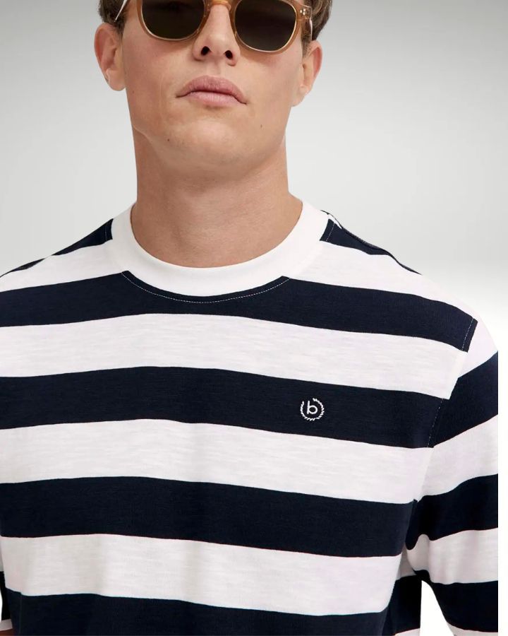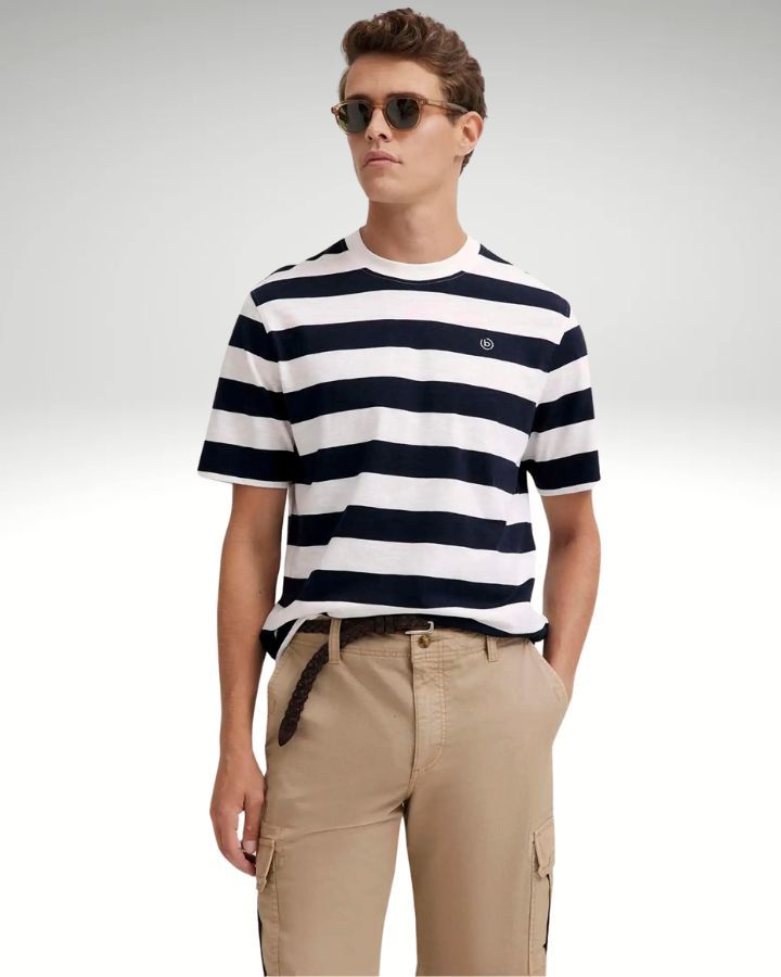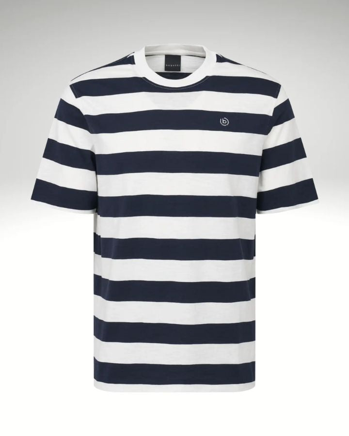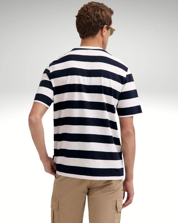 Ce T-shirt raffiné arbore un motif de rayures horizontales en bleu marine et blanc, évoquant un style marin classique. Confectionné dans une matière de haute qualité, il garantit un confort optimal et une excellente tenue. Le détail du logo discret brodé sur la poitrine apporte une subtile touche d'élégance. Avec ses manches courtes et son col rond soigneusement fini, il s’adapte aussi bien à un look décontracté qu’à une allure soignée. Polyvalent et intemporel, ce T-shirt est un ajout essentiel à toute garde-robe moderne.