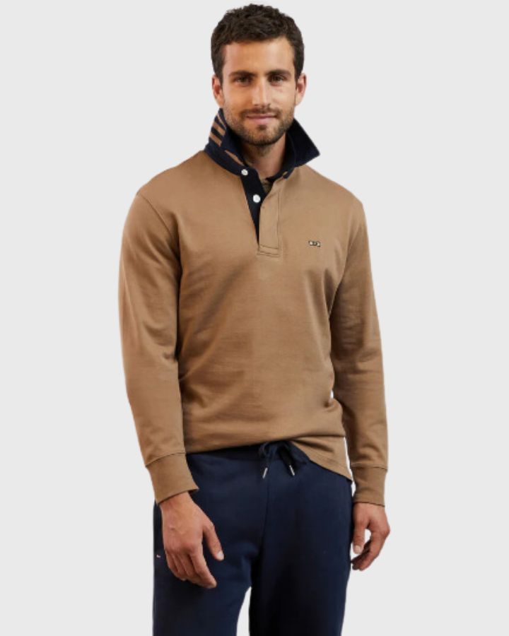 Ce maillot à manches longues affiche un écusson sur la poitrine ainsi qu'un col en twill avec un revers côtelé à bandes bicolores